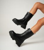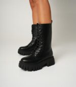 Este borcego es la pieza esencial para quienes aman la estética combat boot con un toque moderno y audaz. Su diseño de caña alta estiliza la pierna, mientras que la plataforma robusta asegura que no pasarás desapercibida.