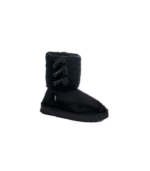Cuenta con un exterior suave tipo gamuza y un interior completamente forrado en material plush, que mantiene los pies cálidos y cómodos durante todo el día. La manga de tejido con detalles de lazos decorativos suma textura y personalidad, mientras que la suela liviana y antideslizante garantiza una pisada estable y segura.
