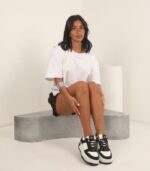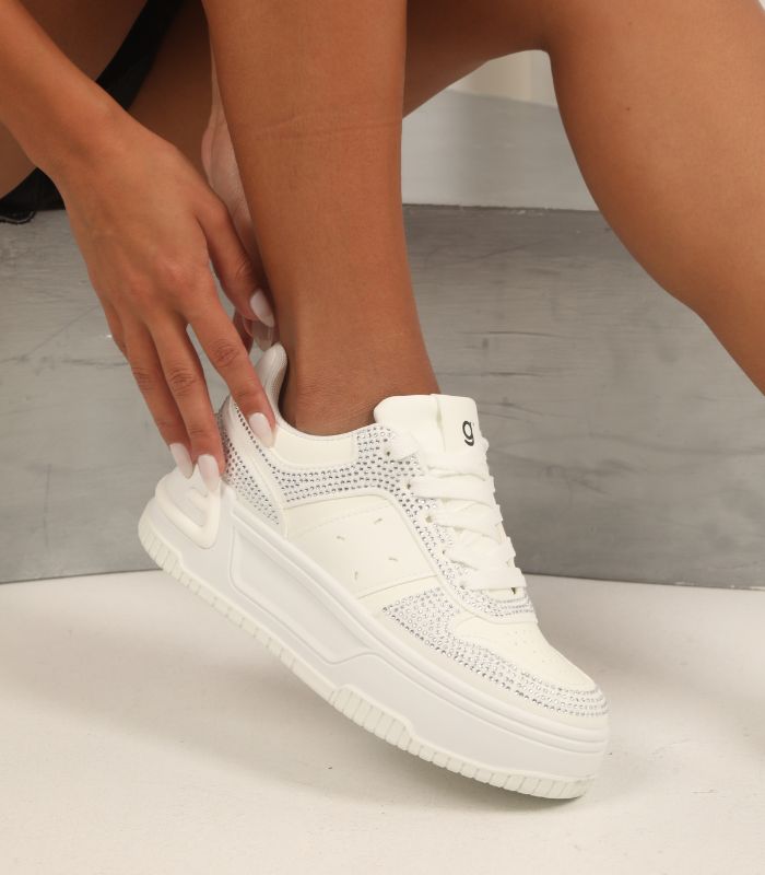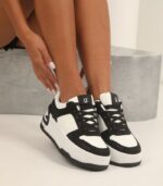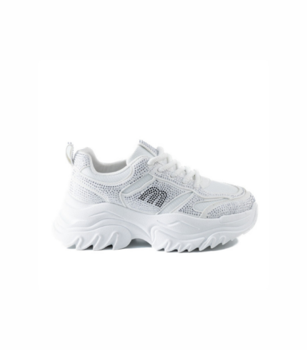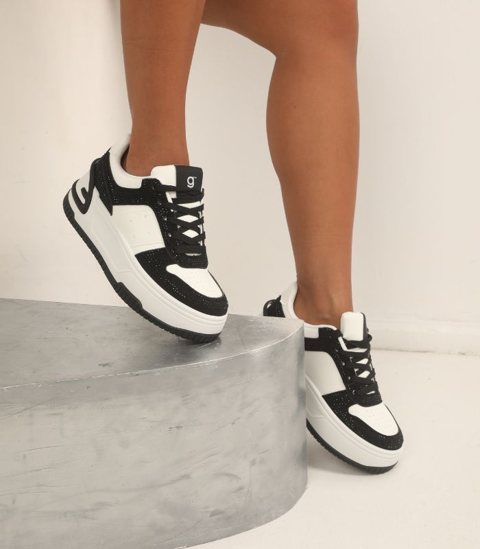 Detalles de Brillo: En la combinación Blanco/Negro (como se ve en la imagen), los paneles negros están cubiertos con un brillo sutil o pedrería que añade un toque glam y sofisticado, haciendo que la zapatilla destaque.