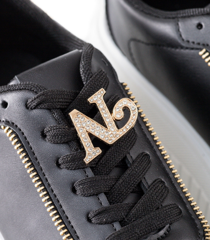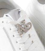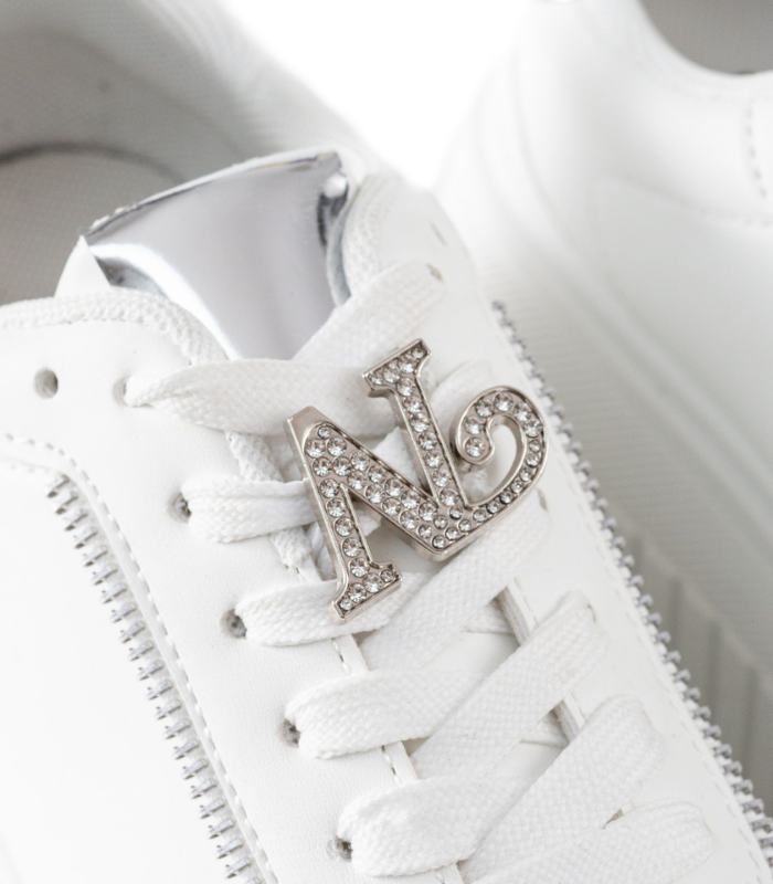 Joyas para tus Pies: Los cordones se adornan con un aplique metálico de strass con la letra decorativa, convirtiendo el calzado en una joya urbana.